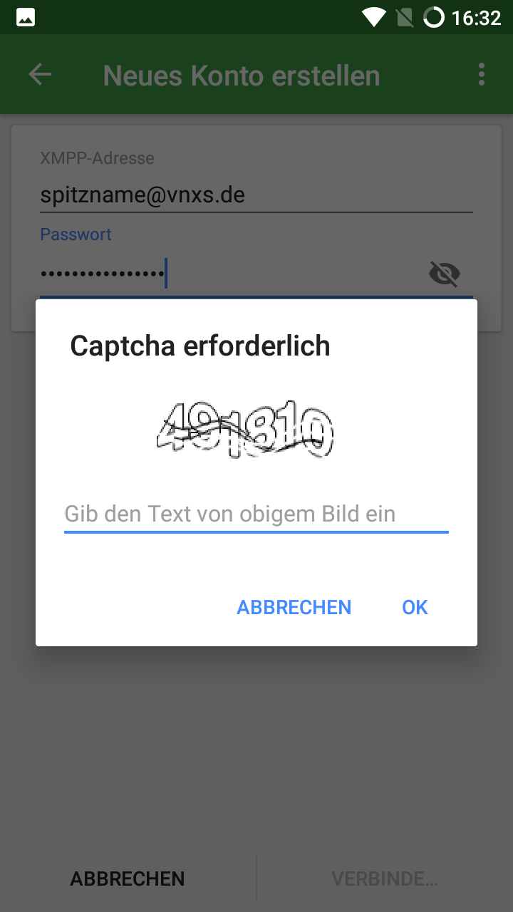 Auf dem nächsten Bildschirm kann man einen Namen für das neue Konto wählen. Dabei ist der Teil vor dem "@" der Nickname, der Teil nach dem "@" der Server, dieser muss "vnxs.de" sein, um sich bei vnxs zu registrieren.