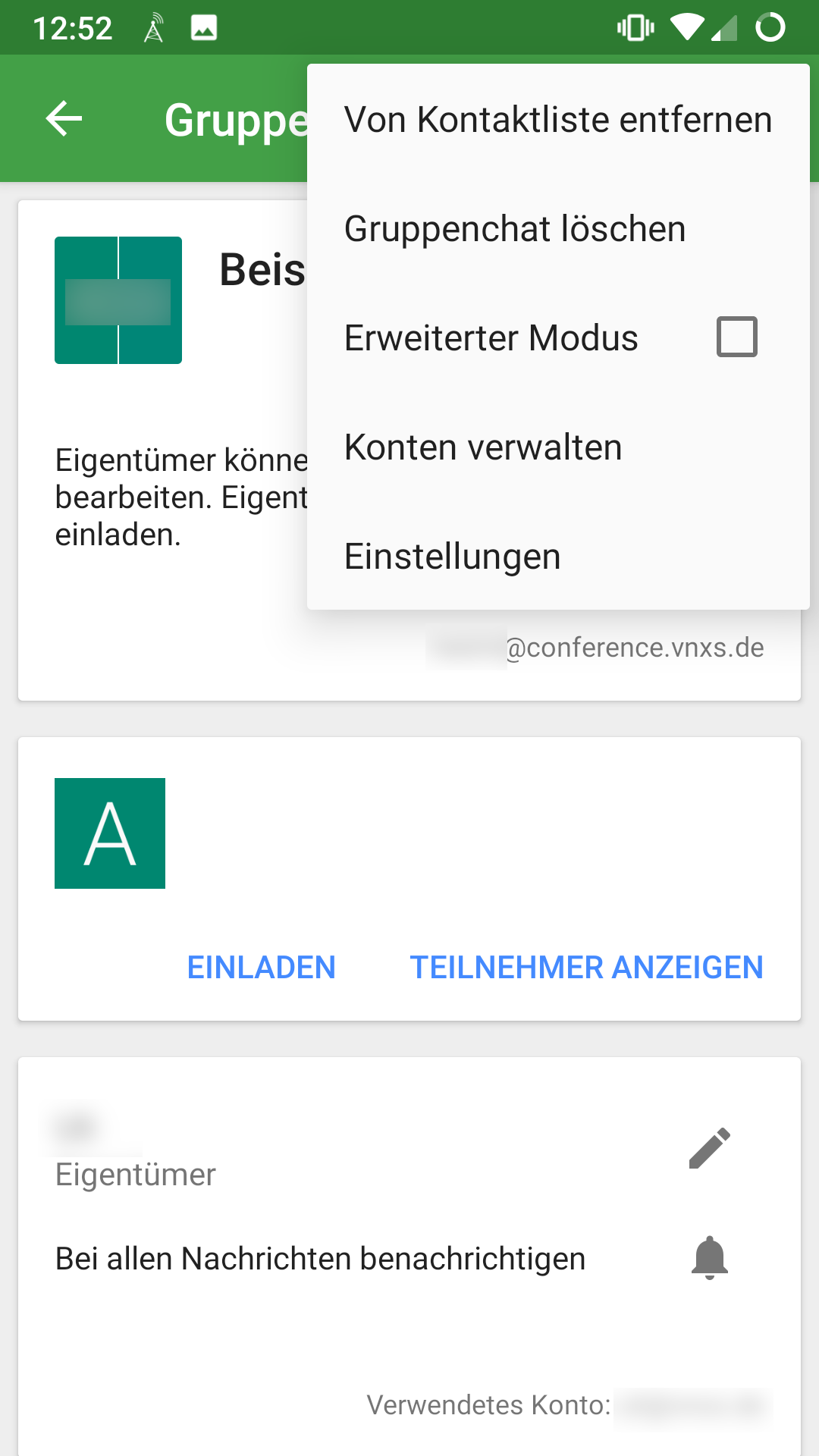 Mit der Option "Kontakte einladen", kann man der Gruppe weitere Teilnehmer hinzufügen. öffnet man die Gruppendetails, kommt man zu folgender Ansicht: