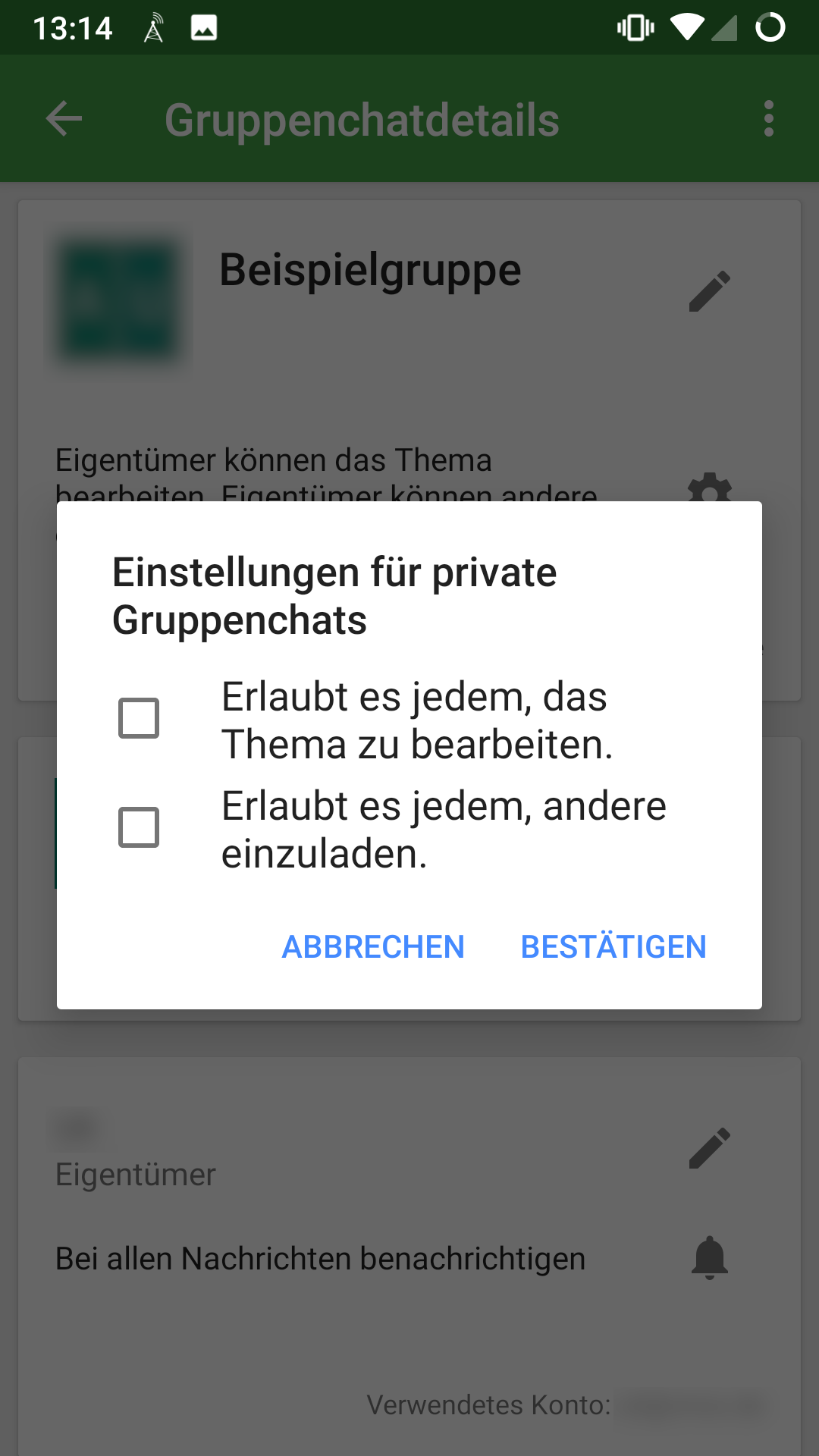 Nach einem Klick auf das Zahnrad kann man wählen, wer das Thema der Gruppe verändern darf und wer neue Mitglieder einladen darf: