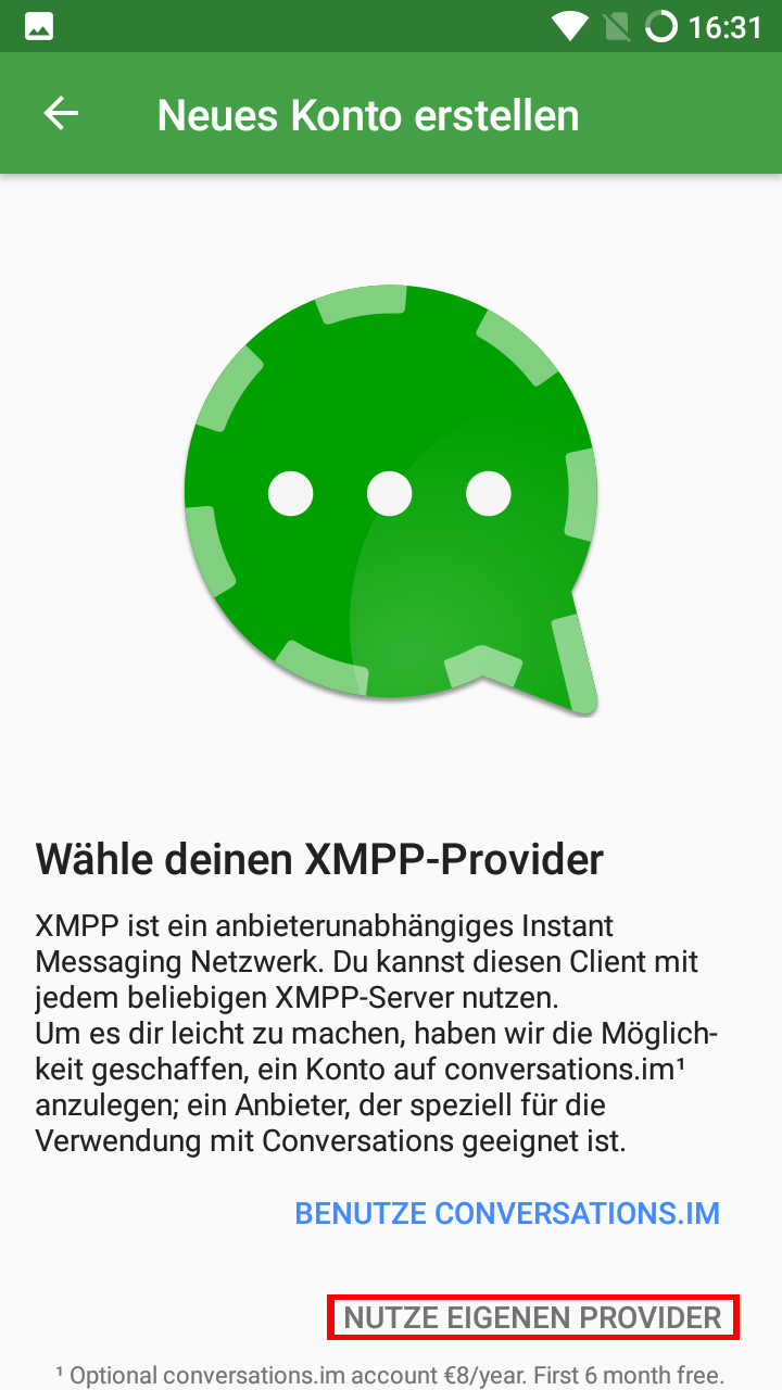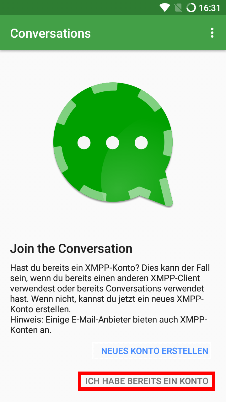 Sollte die Registrierung fehlschlagen, kann man sich auch online registrieren. Danach wählt man in Conversations zu Beginn "Ich habe bereits ein Konto":