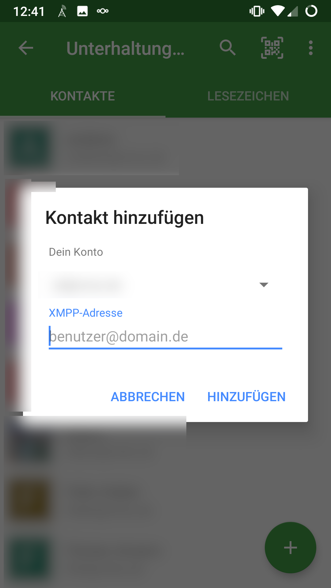 Der oberste Knopf dient dazu, neue Kontakte hinzuzufügen. Hierzu muss man die XMPP Adresse des Kontaktes kennen. Diese muss nicht auf dem vnxs Server sein, es ist möglich XMPP Kontakte von beliebigen Servern hinzuzufügen: