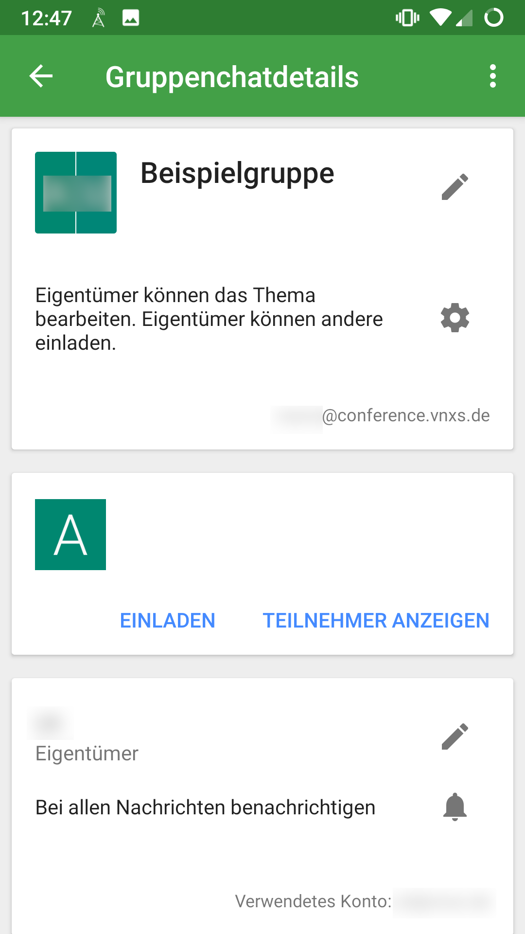 Mit der Option "Kontakte einladen", kann man der Gruppe weitere Teilnehmer hinzufügen. öffnet man die Gruppendetails, kommt man zu folgender Ansicht: