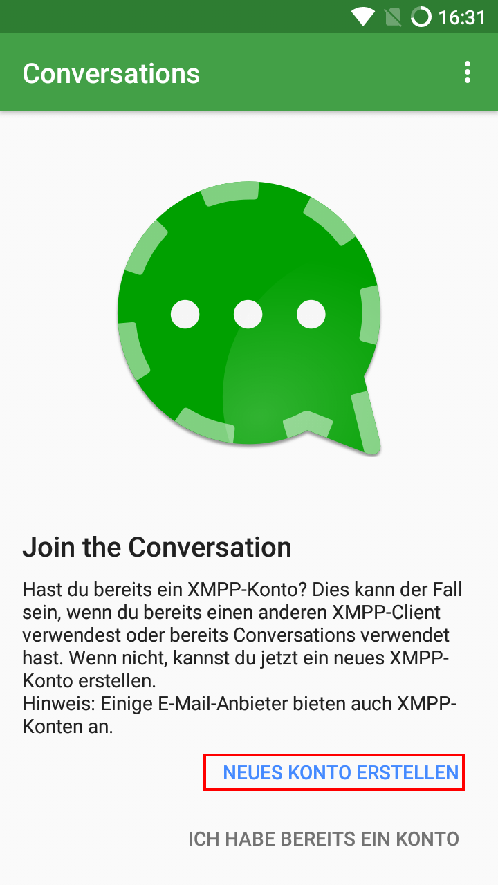 Sollte die Registrierung fehlschlagen, kann man sich auch online registrieren. Danach wählt man in Conversations zu Beginn "Ich habe bereits ein Konto":