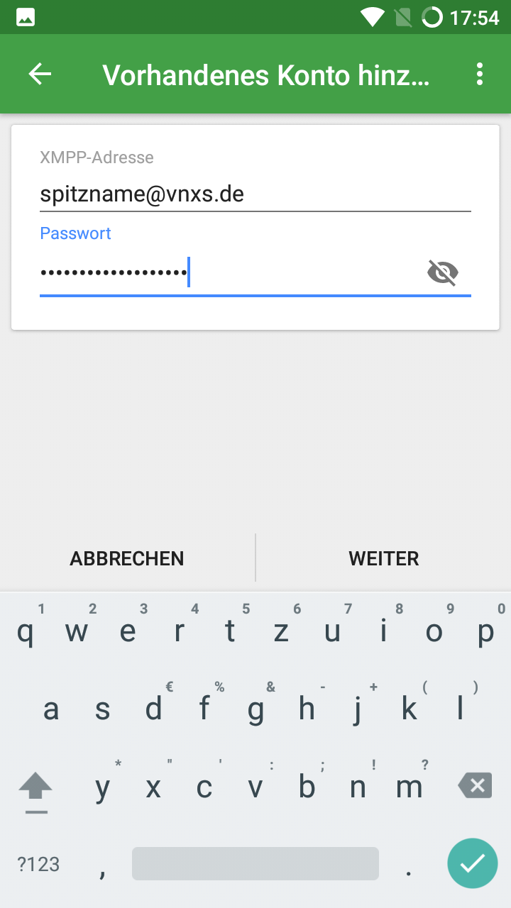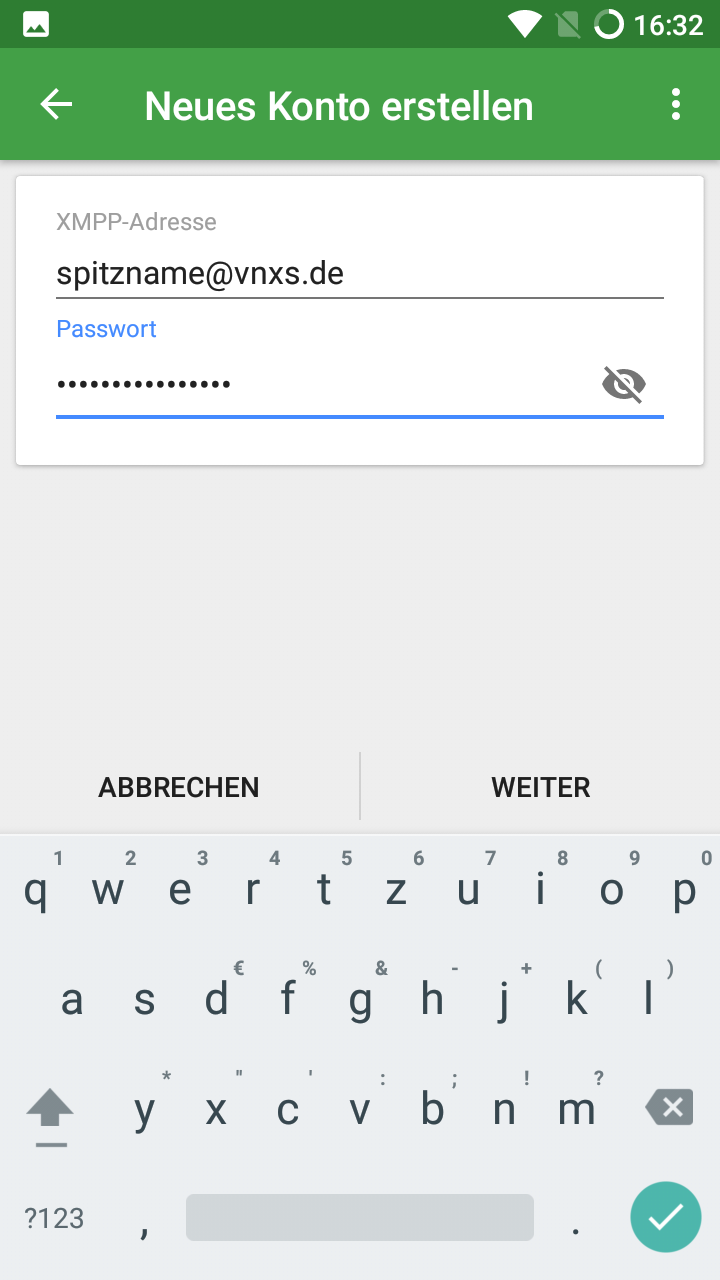 Nun kann man den online gewählten Nicknamen, samt "@vnxs.de" eintragen:
